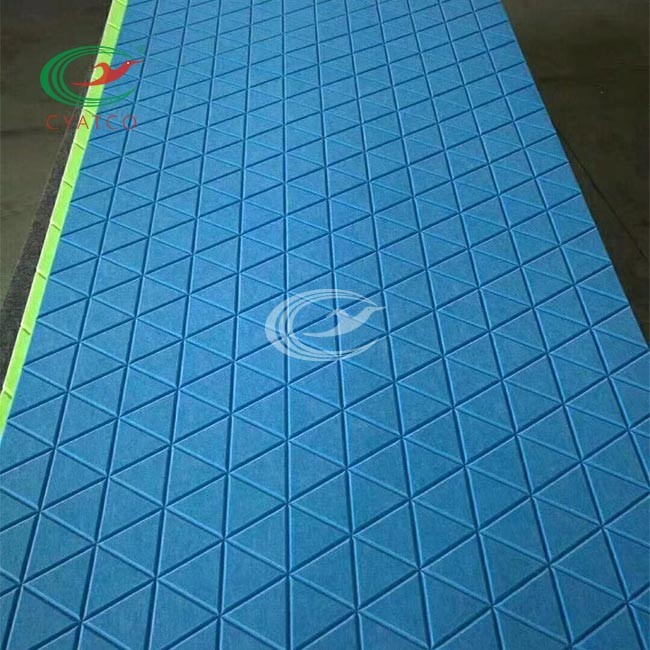 天井板、として使用されるポリエステル有機質繊維板が小さい部分に割り込むことができる時。ポリエステル線維の音響パネルはキールにつくか、またはステッチによって付けることができる。板端は実用的なナイフによって変更することができる。さまざまな切り分けるパターンは可能であり、板はまた余りに曲げることができる。